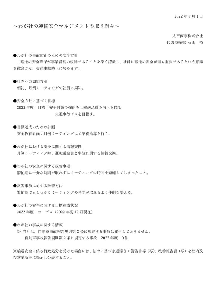わが社の運輸安全マネジメントの取り組み 2025 1/10 2022年12月19日 運輸安全マネジメント2022 業務案内 よかったらシェアしてね! URLをコピーしました! 高性能洗浄除菌剤「オキシライト」好評発売中 日清製粉㈱東北産小麦使用「けっぱれ!東北」新発売