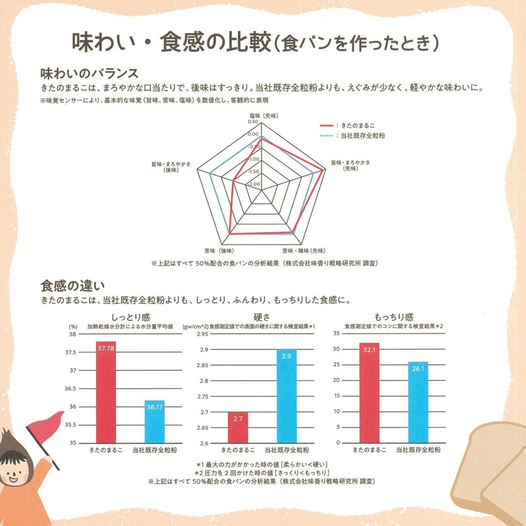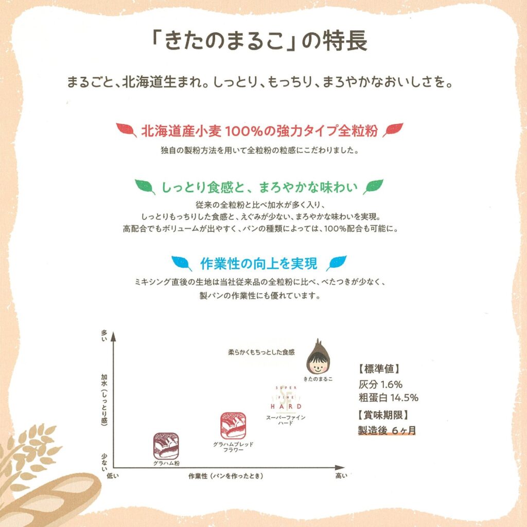 このような課題を解決し、全粒粉パンの市場を活性化させるため、生地のまとまりやすさと、まろやかでしっとりとした食感を実現した小麦全粒粉「きたのまるこ」は開発されました。